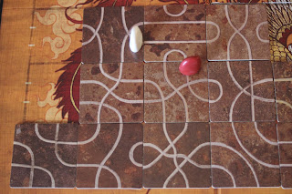 In turn, each player chooses one of his tiles and places it in front of his token, which then travels all the way, never going back, until it reaches a free spot, i.e., a space without a path tile.